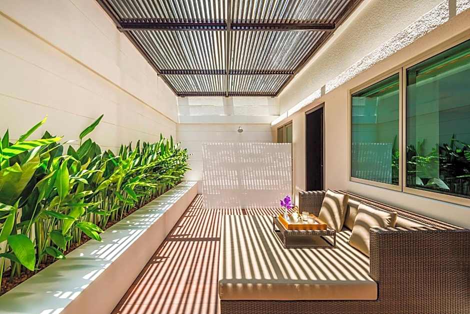 Spacious room features a flat-screen cable/satellite TV and a safety deposit box. There is also a king-sized bed, an L-shaped teak bench and a work desk. Outside, there is a private patio with a sitting area and an outdoor shower. An private bathroom comes with a shower and bathtub.